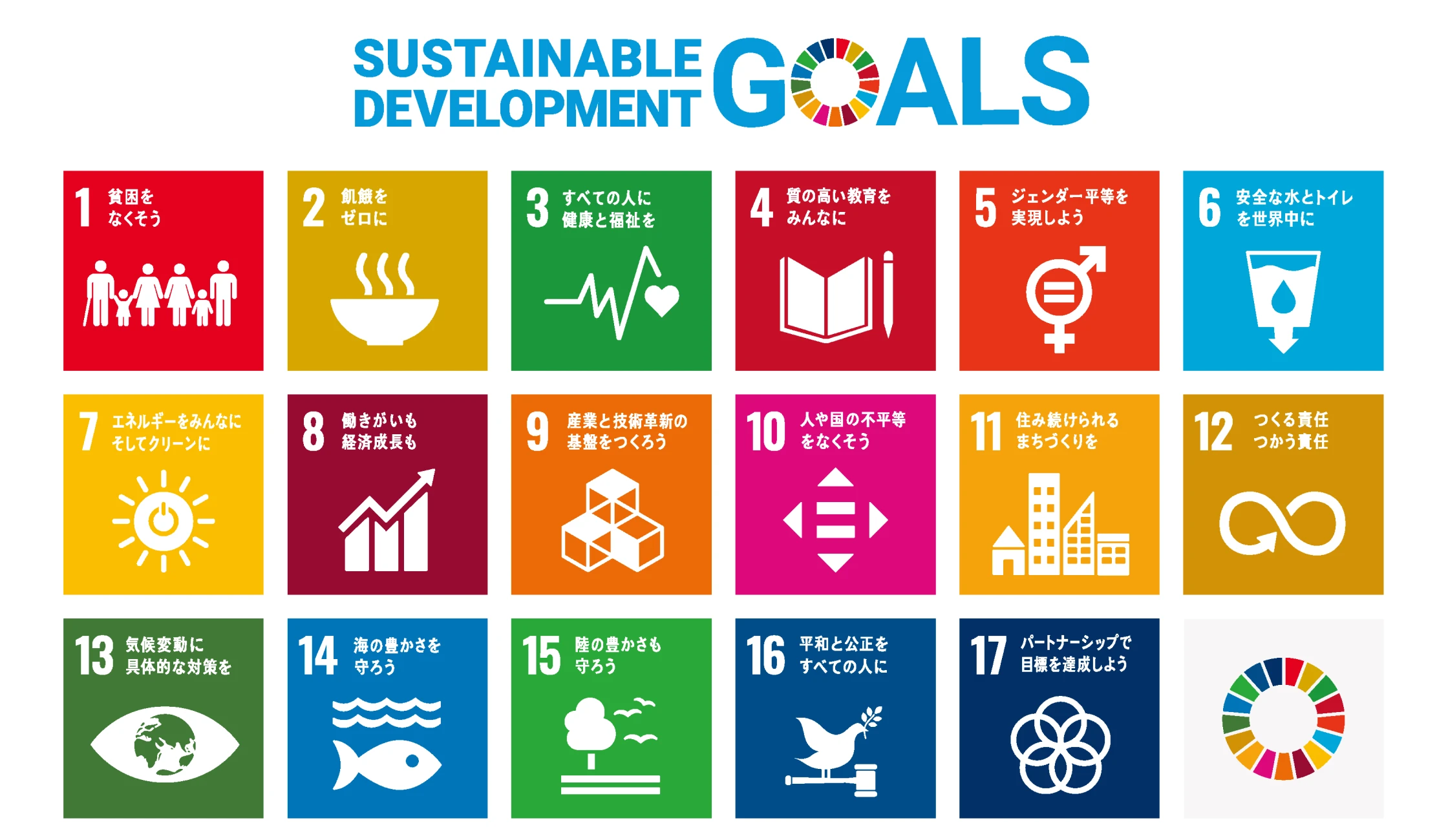 2015年に国連で採択された、2030年までに持続可能でより良い世界を実現するための17の国際目標です。